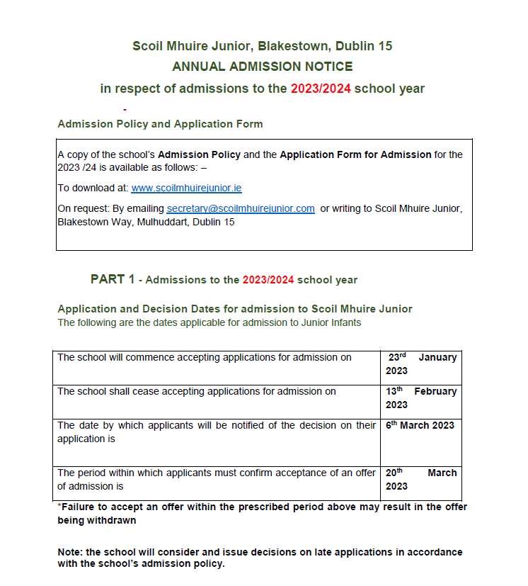 LINK 1: Application for Early Start, Junior Infants and Other Mainstream Classes 2026/2027. For entry to the Early Start Programme, your child must have reached 3 years, 2 months on the 1st of September of the year they begin. For entry to Junior Infants, your child must have reached 4 years on the 31st of August of the year they begin.